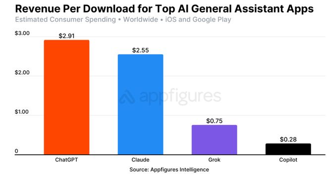Cailianshe,8月16日(编辑Shi Zhengcheng)自大型AI模型行业的发展以来,人们有很多意见,即大型模型易于使用,但Openai在赚钱的能力方面仍然是独一无二的。根据最新的AppFigures分析,自2023年5月推出以来,全球消费者已在ChatGpt应用程序的iOS和Android上花费了20亿美元。这个数字大约是所有其他移动竞争对手(Grok,Claude,Copilot)的30倍。数据显示,在今年的前七个月中,ChatGPT移动应用程序产生了13.5亿美元的收入,这是去年同期的七倍以上。这些数字并不能完全反映每个AI公司的一般收入,但是消费者和公司可以订阅Web Side Services,而每个公司也提供API服务,这表明其竞争对手在移动市场中远非Chatgpt。毫无疑问,Chatgpt也遥遥无期wnloads。估计表明,全球应用程序的累计数量接近6.9亿。当前的平均每月排放量约为4500万,去年头七个月的平均值几乎是平均1800万的两倍。有了安装,印度是CHATGPT应用程序的最大市场,占累积排放的13.7%。 uu。继续,占所有排放的10.3%。从这个意义上讲,即使获得了面具奖金,Grok自今年1月推出移动终端以来仅累积了3950万下载。这可能是马斯克最近抱怨苹果应用商店“偏见”的主要动机。虽然下载次数很大,但Chatgpt是“累积消费的Descunique Arga”的主要位置。AppFigues统计数据发现,每次出院的全球CHATGPT累积消费量为2.91美元,超过了2.55美元的Claude。 Grok并不便宜,但是在这个数字中,它仅花费$0.75。 (来源:AppFigures)从美国的订阅收入角度来看。每单位10美元的排放量,占迄今为止所有申请中所有收入的38%。该公司增加了现金消耗预测,表明它可能会在2025年提高其先前140亿美元加斯塔多斯(Gastados)的预后。阿尔特曼(Altman)的首席执行官上周表示,正确的方法是继续投资计算机力量并继续增长。他说:“虽然我们仍然处于模型中连续和戏剧性改进的陡峭曲线中,但一种合理的方法是想要。我很长一段时间都损失了钱,我想继续这样做一段时间。”同时,OpenII的主要竞争者人类最近获得的年收入几乎是年初的四倍。他曾经告诉投资者,该公司的收入在2026年可以达到120亿美元。